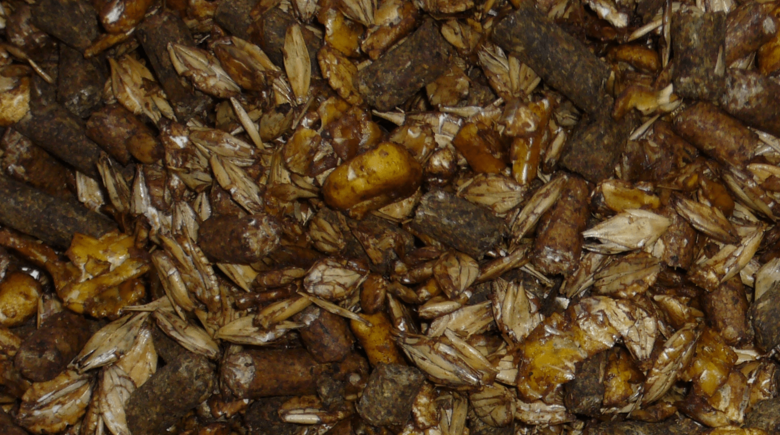 Looking at the individual components, the pellet sorted out in the picture weighs 0.7 g, the yellow chunk only 0.3 g and the husk almost nothing. However, raw fibres are concentrated in the husk in particular.