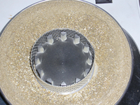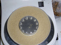 A larger quantity of the sample was first pre-shredded in several batches with the PULVERISETTE 14 classic line using a 2 mm sieve and then a partial quantity was again finely crushed with the PULVERISETTE 14 classic line, but this time with a sieve with a mesh size of 0.2 mm. Pictured on the right: A glance into the opened collecting pan of the mill, after the sample is put through the 2 mm sieve. Visually the result is still clearly inhomogeneous. For the creation of a smaller mixed sample, for the second step of the comminution, by all means a sufficient mixing and exact sample division is to be kept in mind. For the division of the sample we recommend the Rotary Cone Sample Divider LABORETTE 27.