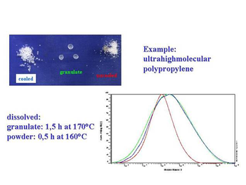 This process is a kind of liquid chromatography similar to the HPLC. Due to the size of the molecules the separation takes place in the solution. Depending on the detector, the average value of the molar mass, polydispersity and the viscosity of the polymer sample are determined. Here suitable sample preparation is important in order to dissolve the polymers. The degradation - the destruction of the characteristics of the material - has to be avoided though. An ideal solution for the sample preparation is the Variable Speed Rotor Mill PULVERISETTE 14 classic line. Here a final fineness of < 80 µm ís achieved. An embrittlement of the polymer with liquid nitrogen, or the grinding while adding dry ice avoid the degradation. The following graphics illustrate the analysis of PE (polyethylene) and PP (polypropylene):